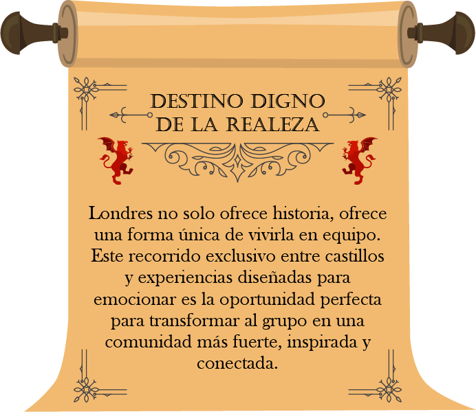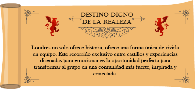 Londres se convierte en el escenario perfecto para un viaje de incentivo empresarial inolvidable, donde cada castillo, salón y pasadizo histórico se transforma en una experiencia diseñada para inspirar, fortalecer lazos y despertar la imaginación colectiva de tu equipo de trabajo. Una aventura exclusiva que celebra la grandeza del pasado con vivencias únicas y significativas en el presente.